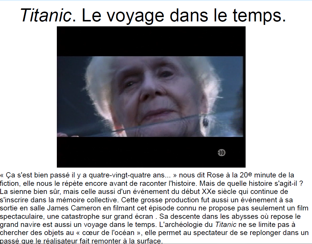 « Ça s'est bien passé il y a quatre-vingt-quatre ans... » nous dit Rose à la 20e minute de la fiction, elle nous le répète encore avant de raconter l'histoire. Mais de quelle histoire s'agit-il ? La sienne bien sûr, mais celle aussi d'un événement du début XXe siècle qui continue de s'inscrire dans la mémoire collective. Cette grosse production fut aussi un événement à sa sortie en salle James Cameron en filmant cet épisode connu ne propose pas seulement un film spectaculaire, une catastrophe sur grand écran . Sa descente dans les abysses où repose le grand navire est aussi un voyage dans le temps. L'archéologie du Titanic ne se limite pas à chercher des objets au « cœur de l'océan », elle permet au spectateur de se replonger dans un passé que le réalisateur fait remonter à la surface.